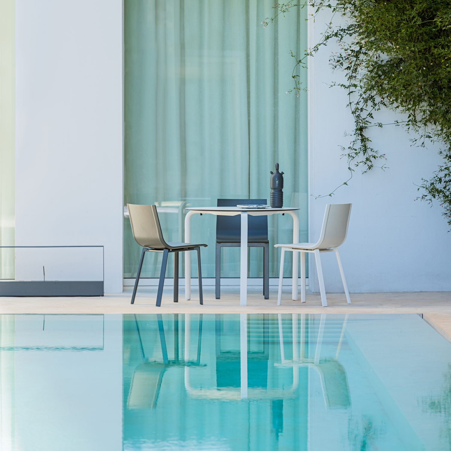 Pejsene er produceret i lakeret aluminium og passer med sit minimalistiske udtryk perfekt sammen med den enkle, stilrene og nordiske stil. Trods middelhavets sol og varme skinner igennem er stilen minimalistisk og unik og helt i tråd med den mere nordlige designtradition.